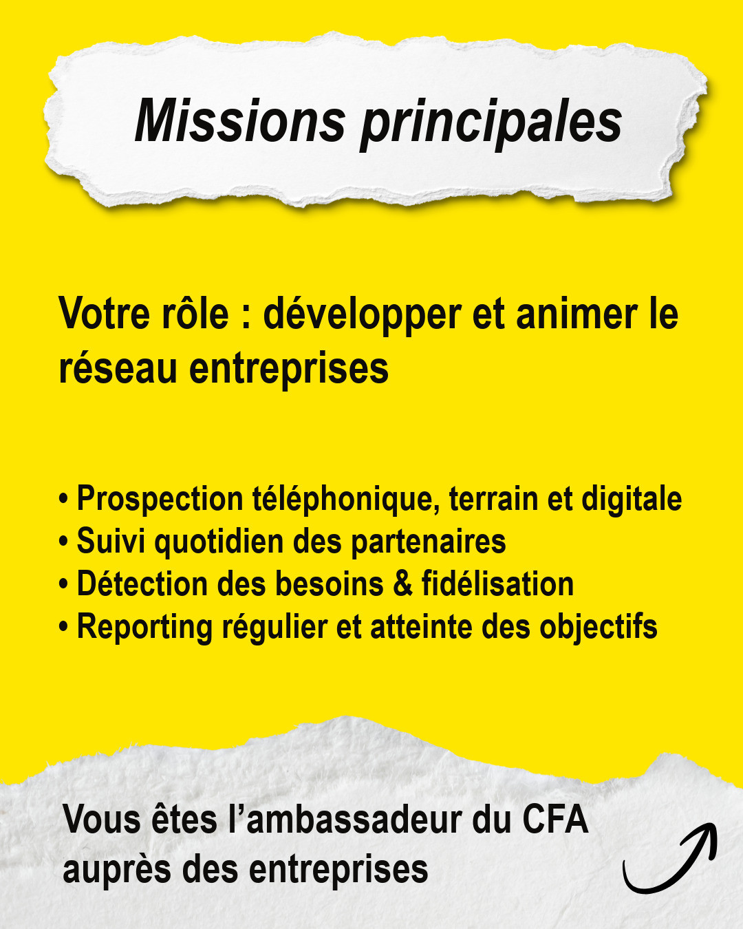 Sous l’autorité de votre manager, vous serez en charge du développement, de la gestion et du suivi des entreprises, avec un fort accent sur la relation client.