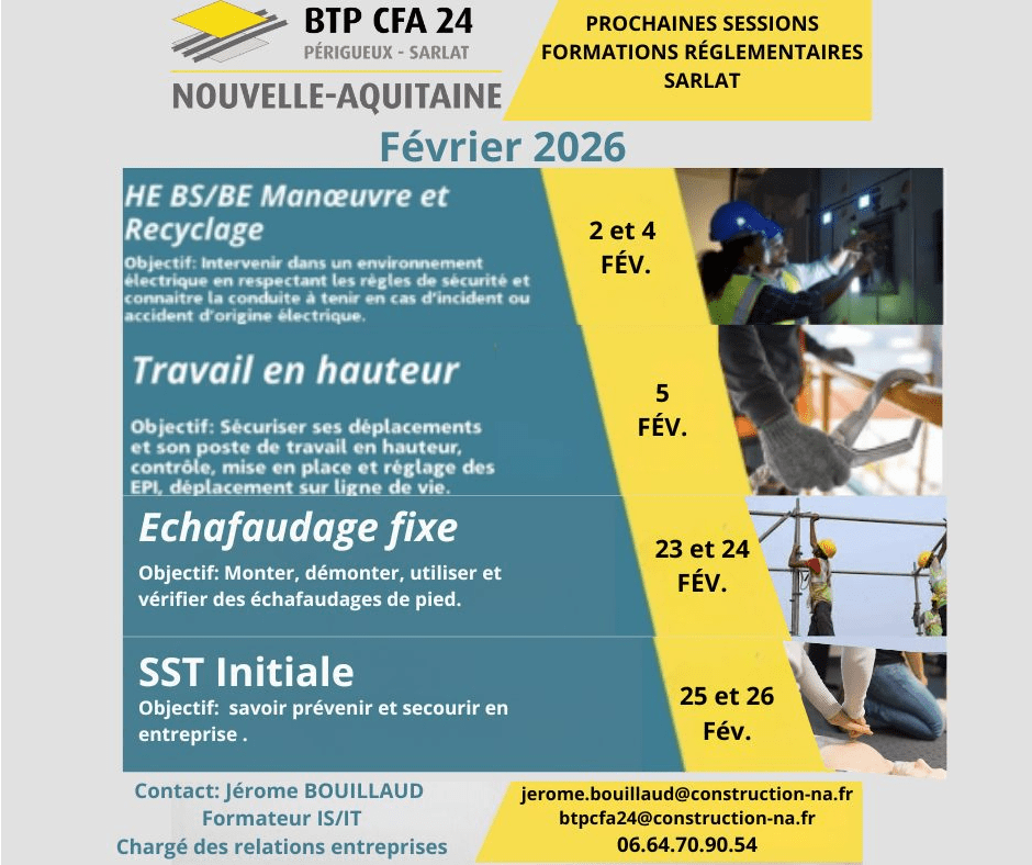 Le BTP CFA 24 organise plusieurs sessions de formation essentielles pour vos équipes tout au long du mois de février.Voici le programme : Habilitation électrique – Initiale & Recyclage Du 02 au 04 février Travaux en hauteur Le 05 février Échafaudage fixe Du 23 au 24 février SST – Sauveteur Secouriste du Travail (Initiale) Du 25 au 26 févrierVous souhaitez inscrire vos collaborateurs ou obtenir plus d’informations Contactez Jérôme Bouillaud jerome.bouillaud@construction-na.fr btpcfa24@construction-na.fr 06 64 70 90 54#BTPCFA24 #FormationBTP #Sarlat