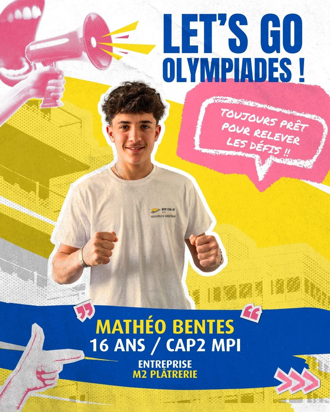 Les Olympiades des Métiers – WorldSkills France mettent à l’honneur les meilleurs jeunes professionnels dans près de 70 métiers, dont ceux du bâtiment. 🏗️Au BTP CFA 47, certains de nos apprentis vont vivre cette aventure avec les premières sélections régionales, qui pourraient leur donner l’opportunité d’intégrer l’Équipe de France des Métiers. 🇫🇷👉 C’est le cas de Mathéo Bentes, apprenti en CAP 2ᵉ année MPI (Métiers du Plâtre et de l’Isolation) dans l'entreprise M2 Plâtrerie, qui répond à quelques questions dans ce carrousel.