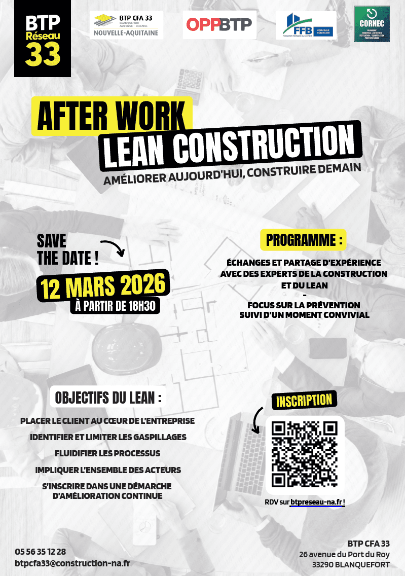 Participez à un after work dédié à la découverte du Lean Construction, une approche innovante d’organisation, de planification et de management appliquée au secteur de la construction.